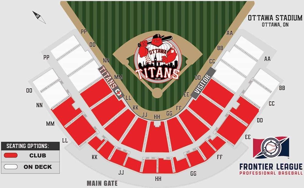 This Stadium can fit more than 10000 spectators during the baseball match. It is the home ground of Ottawa Titans. Club and On Deck are the two seating options available on the ground. The names of the stands are marked on the image along with the location of the main gate. The type of seating is colored differently. This stadium is mainly used for the hosting of Frontier League Professional Baseball matches.