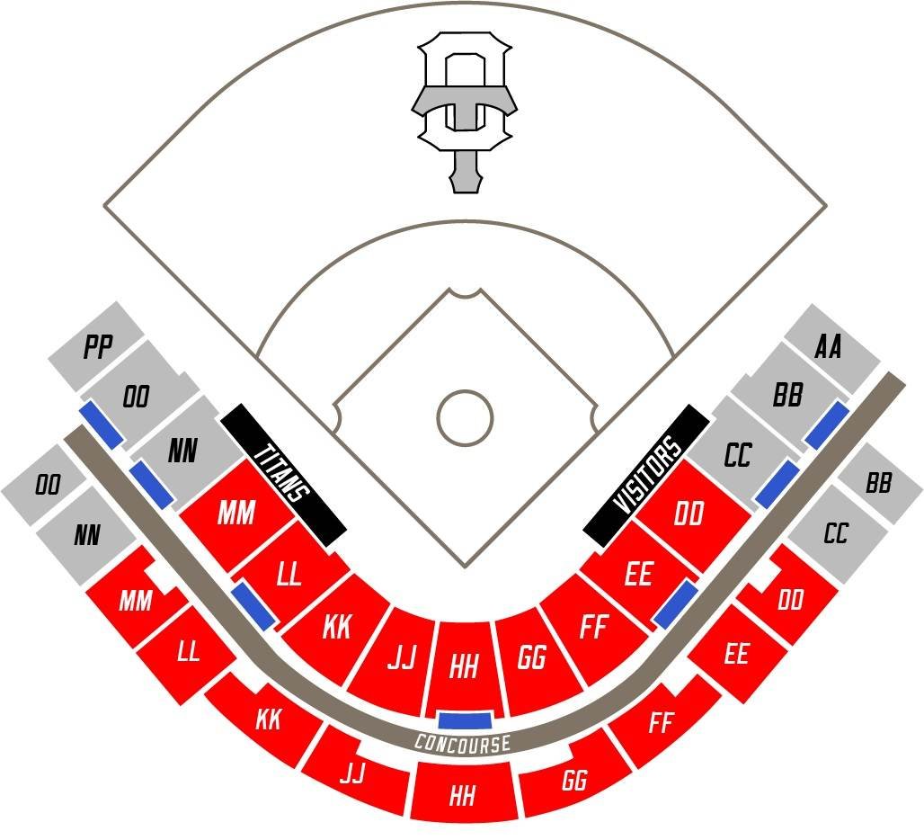 The location of the Concourse, visitors area, and Ottawa Titans area is depicted on the seating layout map. It is easier to find seats in this Stadium with the help of the Ottawa Baseball Stadium seating chart with seat numbers and rows.