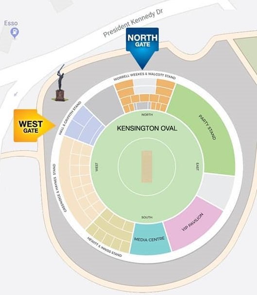 This ground is a big stadium in terms of seating capacity and with the help of the Bridgetown Kensington Oval seating plan, visitors will easily locate their seats. This stadium is also used for hosting concerts and the seating plan for the concerts is different than the Sporting event. All the stands and general ground are mentioned on the map along with the entry gates. The food and drinks option is also marked on the map. Nearby roads and streets are also mentioned on the map. The name of the stands is marked on the Kensington Oval Stadium layout map. Visitors can use this Stadium while visiting this Stadium for cricket matches and other events.