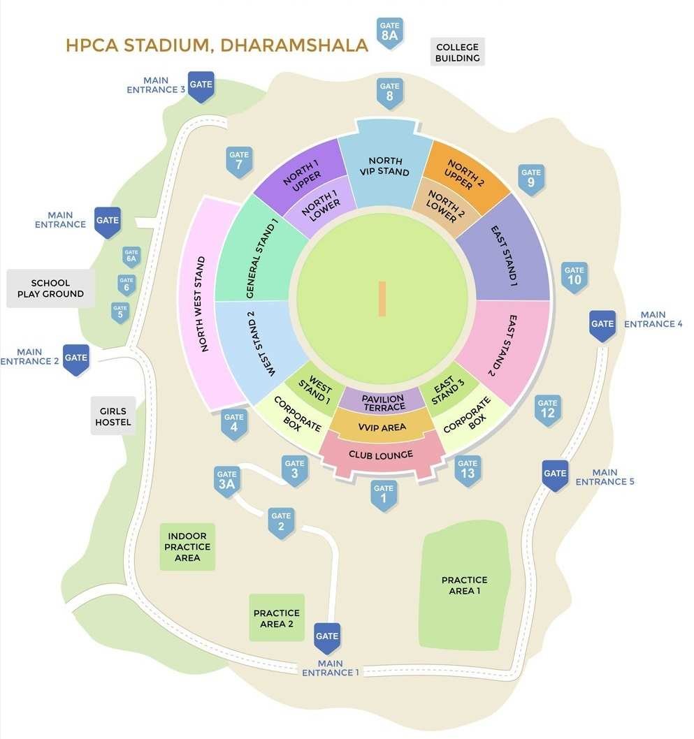 The above map of Dharamshala Cricket Ground shows all the main entry gates of the stadium along with nearby roads. The main entrance gates of the stadium and stadium entry gates are clearly shown on the map. Nearby landmarks are also depicted on the map clearly. The location of the stands of Dharamshala Cricket Ground along with the pitch is very helpful in picking the best view seats in the stadium. The detailed maps of HPCA stadium are very helpful while visiting the stadium and finding seat numbers. The location of the indoor practice area and outdoor practice area is also shown on the map.