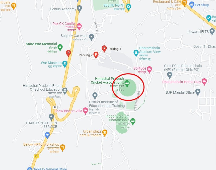 Dharamshala Stadium is located in the hilly terrain and very limited parking space is available. It is very tough for the visitors on match days who are coming in their own vehicles. Visitors are advised to use public transport or any other mode to raise the stadium on match days. The whole city is situated on hilly terrain, therefore, limited parking space is available in the city near the stadium.