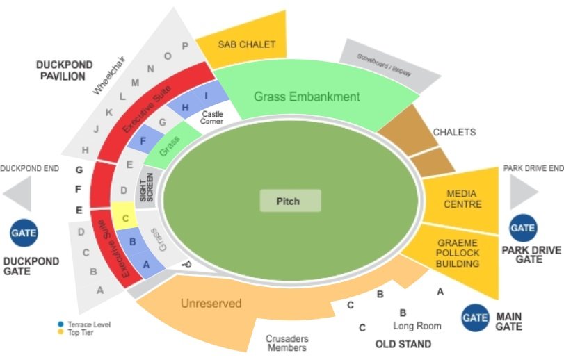 Centurion Park seating map shows all the stands of the stadium in a detailed manner. The location of the pitch, name of the stands, unreserved area, grass area, sightscreen, terrace level, top level, etc are mentioned on the map. All the entry gates of the stadium, the wheelchair area, the chalet area, the media center, the Graeme Pollock building, etc are also depicted on the map.