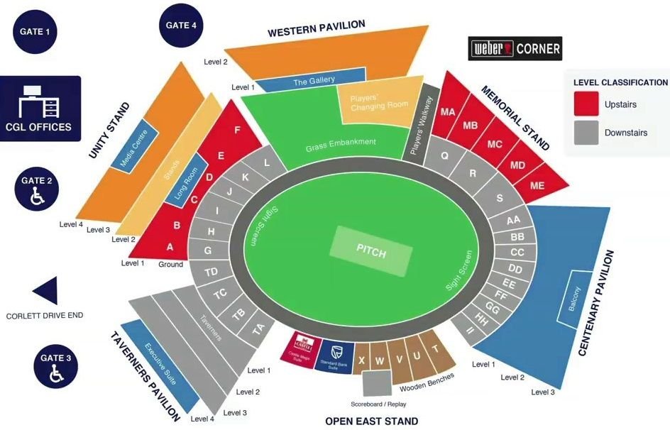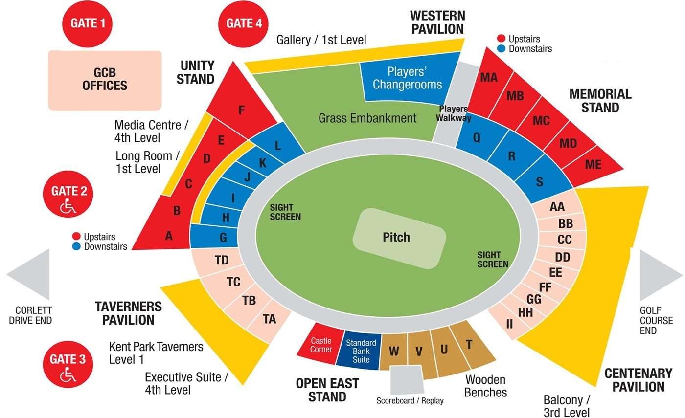 All the stands of the stadium along with their numbers are depicted on the Stadium layout map. The location of the pitch, sight screen, grass area, players’ changerooms, pavilion, etc is shown in the image. All the entry Gates along with the accessibility gates for the visitors are mentioned on the seating layout map of the stadium.