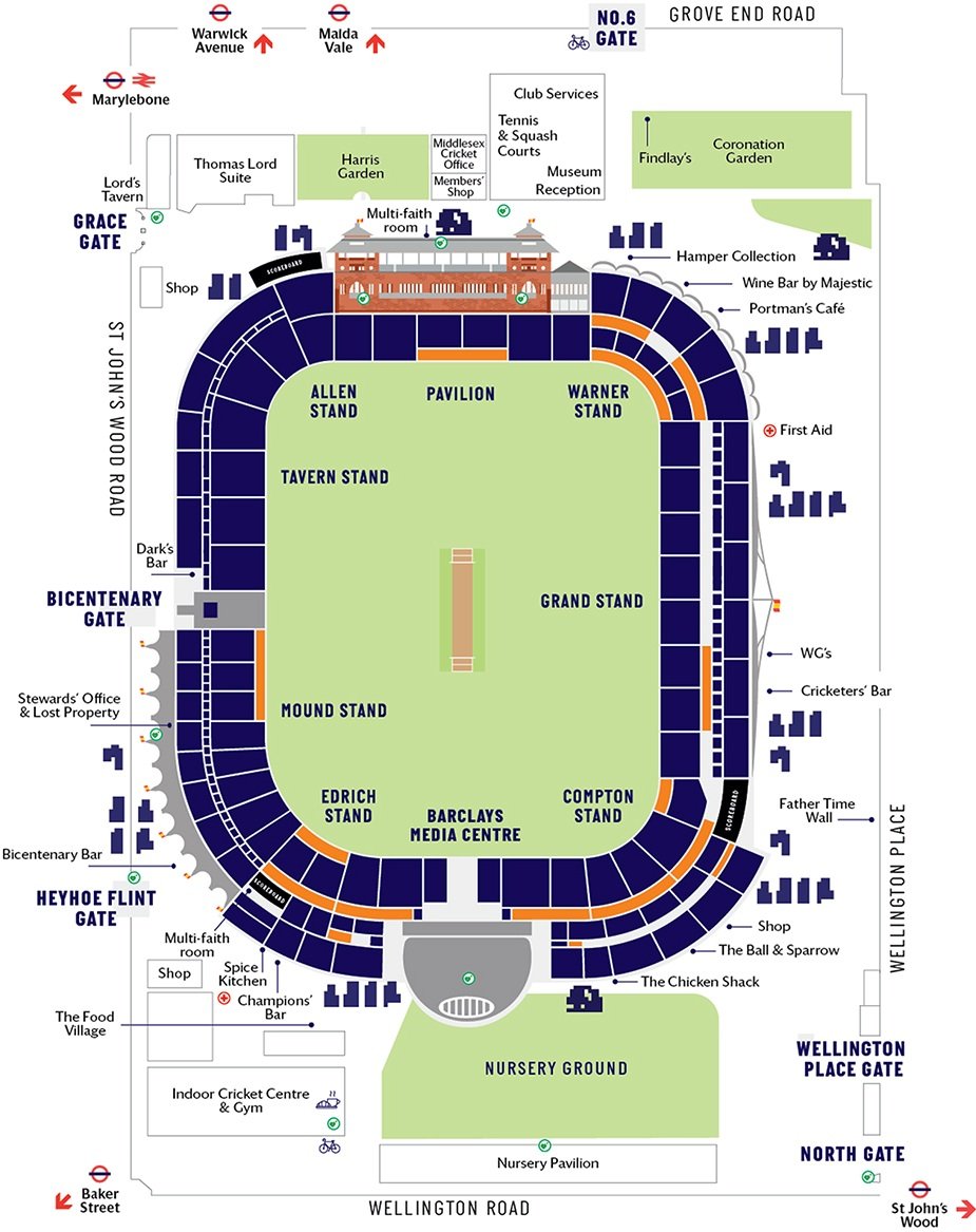 The layout of the Lord’s Cricket Ground shows the location of all the stands along with their names. The name and number of the rows can be seen on the seating arrangement chart. All the nearby locations, landmarks, entry gates, metro stations, streets, roads, etc, are indicated on the map.