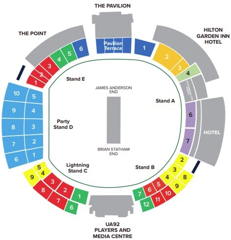 The location of the premium seats, pavilions, members’ area, lounges, suites, restaurants, and other premium areas on the map. Some of the sections are reserved for members and esteemed guests. The location of all the important areas are shown on the map. The home games of Lancashire County Cricket Club are hosted at this ground, and the layout helps in locating the pre-booked seats in advance. 19000 guests can be seated during the club games and 26000 during international games.