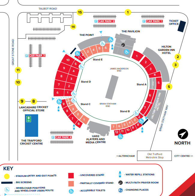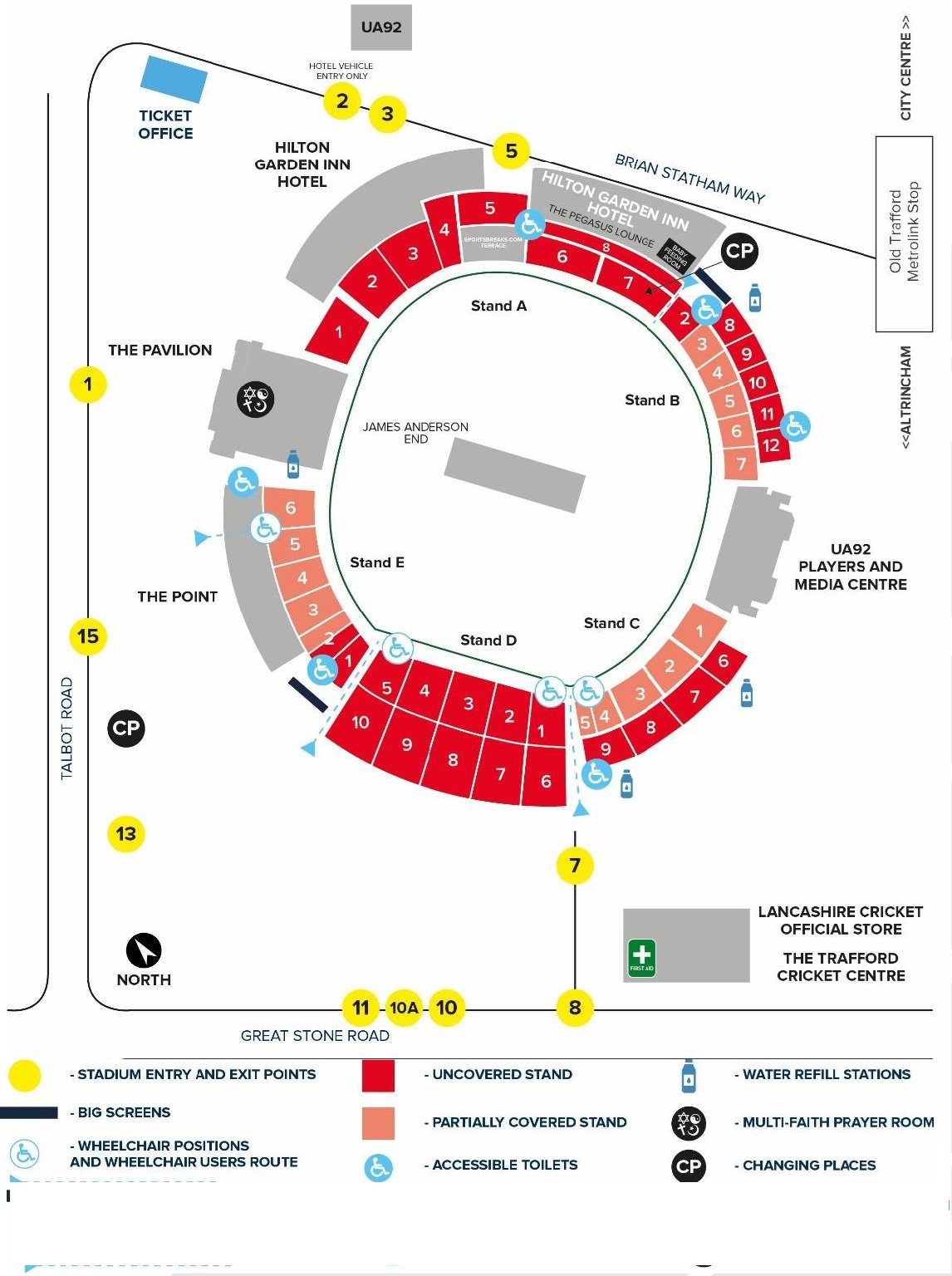 The names of the stands, along with the row numbers, can be seen on the Old Trafford Stadium seating chart to locate the seats. Some of the sections in the stadium are reserved for accessible guests. The location of wheelchair friendly areas, lifts, ramps, toilets, and other important amenities are mentioned on the map. This Stadium has multiple entry and exit doors. The location of entry gates, uncovered stand, covered stands, partially covered stands, water refill stations, changing places toilets, big screen, etc are also depicted on the Manchester cricket stadium Map, Old Trafford.
