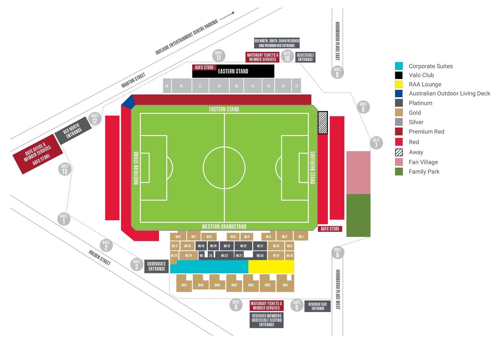 The seating layout map of Coopers Stadium located in Hindmarsh is showing all the important details of the stadium. All the stands of the stadium along with the important areas are clearly depicted on the map. Corporate suites, lounge, platinum, gold, silver stands, family park, and fan village are also clearly marked on the map. The location of the Eastern Stand, Western Stand, Northern Stand, and Southern Stand is also drawn on the Hindmarsh stadium map. All the entry gates along with the VIP entrance, accessible entrance, and Club entrance of the stadium are clearly located on the map. The location of the nearby roads on the Coopers Stadium seating chart 2026 is helpful in reaching the stadium.