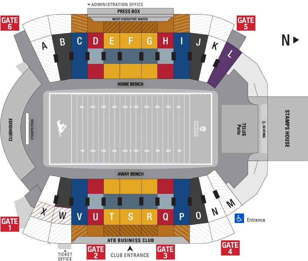 All the entry gates of the stadium along with stadium rows are depicted on the seating layout map. The location of the home benches and away benches is drawn on the map. The location of the wheelchair-accessible entry, wheelchair seatings, ATB Business Club, West executive suites, press box, clubhouse, stamps house, TELUS Patio, STAMPSTRON, administration office, etc are also depicted on the map.