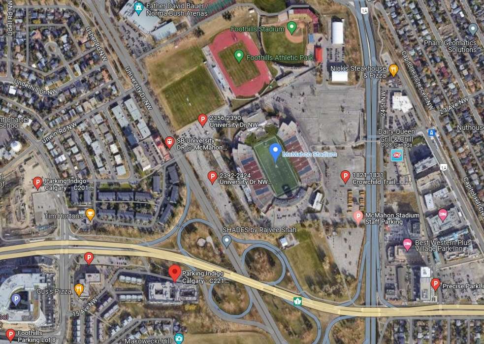 With the help of a parking map, it is easy for visitors to reach the venue without any difficulty. All the nearby parking lots, public transit options, and roads connecting to the stadium are marked on the map. The address of the stadium is 1817 Crowchild Trail NW, Calgary, AB T2M 4R6, Canada.