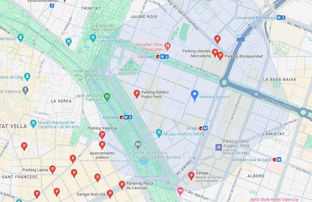 This stadium is located in a busy locality and parking is difficult during the hosting of Valencia CF matches and other high-voltage matches. The parking location is around a 5-minute walk from the stadium. Multiple parking lots are available near the Mestalla Stadium. Visitors should use public transport to reach this stadium easily as during the hosting of big games, it is tough to get a proper parking spot.