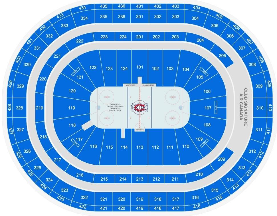 The Bell Centre Arena seating is divided into 3 levels for general visitors. Level 100, level 200 and level 300 to 400 is clearly depicted on the map. The location of the field along with the pitch is clearly marked on the map. The location of the Canadiens and visitors stand is clearly depicted on the map along with the location of luxury suites. The luxury suites are located on level 3 and level 5. All the important information is depicted on the Bell Centre seating chart with rows and it is very useful to find seats in this large Arena.