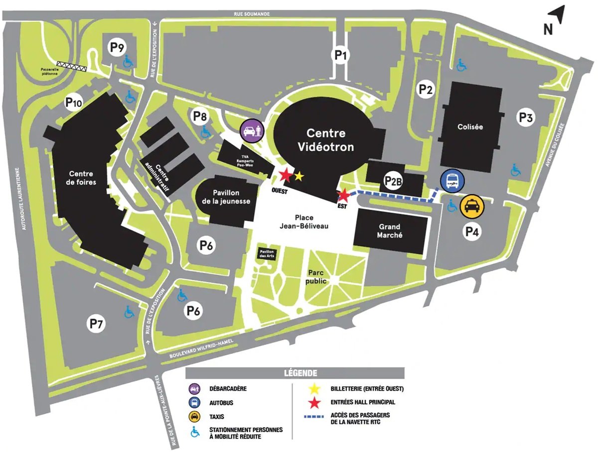 Videotron Centre Arena has onsite parking and it can accommodate around 4755 vehicles during the events or concerts. The location of the parking lots is clearly marked on the map. The location of the nearby roads and streets is also depicted in the image. Accessibility parking area, location of taxi area, pick and drop location, bus location, entry area, etc is also mentioned on the Videotron Arena parking map. The parking map of the Videotron Arena is also very helpful in finding the nearby roads to reach this venue easily.