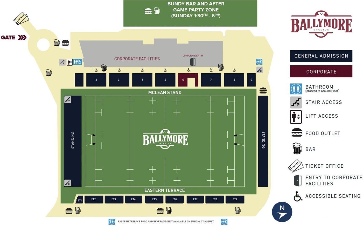The seating capacity of the stadium is 18000, however, it is capped for 8000 spectators only. All the important details of the stadium is shown on the below map of Ballymore stadium. The general admission area and corporate seating is marked by different colour. The location of bathrooms, stair access, lift access, food outlet, bar, ticket office, entry gates, accessible seating, etc is depicted on the map.