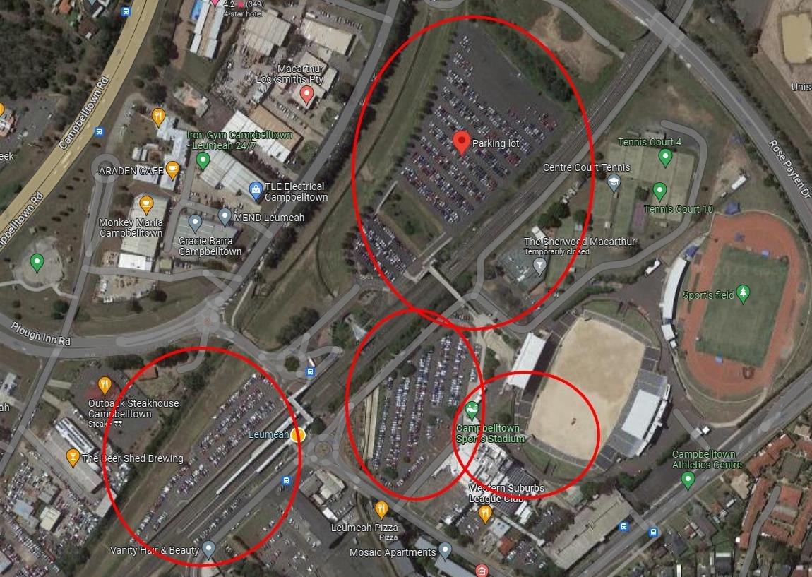 The above image taken from Google Maps shows all the nearby parking lots to the Campbelltown Stadium.