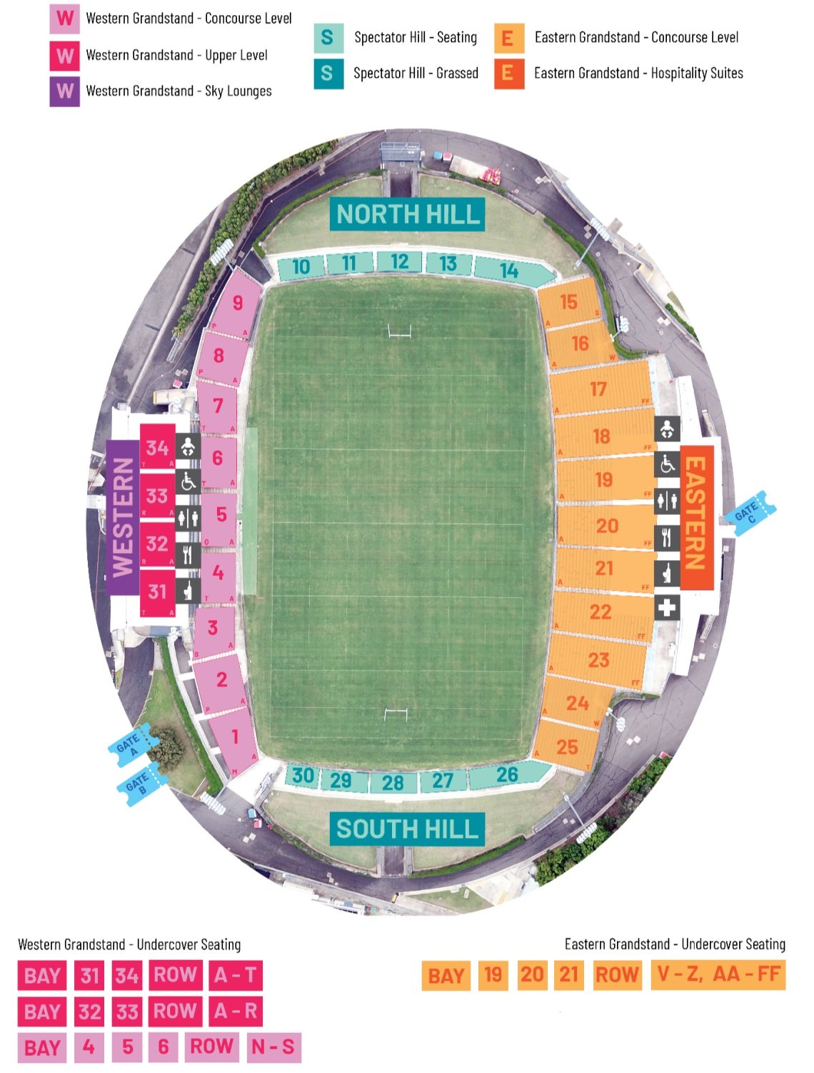 Dawab layout map of Campbelltown Sports ground shows the location of accessible seating, baby changing room, toilets, restaurant, and bars. The location of all the entry gates is also very clear in the above image. Visitors can refer to the Campbelltown Sports Stadium seat map to find their seats while visiting this Stadium.