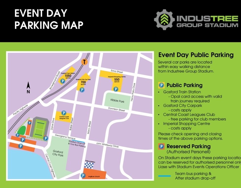 The above parking map of the Industree group stadium shows all the public parking areas near the stadium. The reserved parking area near the stadium is reserved for authorized personnel on events day. Most of the public parking areas are located in the vicinity of the stadium and the rest of the distance can be covered easily by walking. Visitors are advised to check the opening and closing times of the parking lots before reaching the parking lot. Central Coast Stadium parking map 2026 also Shows the nearby roads, public transport options, and parking lot spaces in the image. Visitors can also use multiple public transport options to reach the venue like train, bus, ferry, taxi, etc. Gosford Train Station is around 300 m from the stadium.