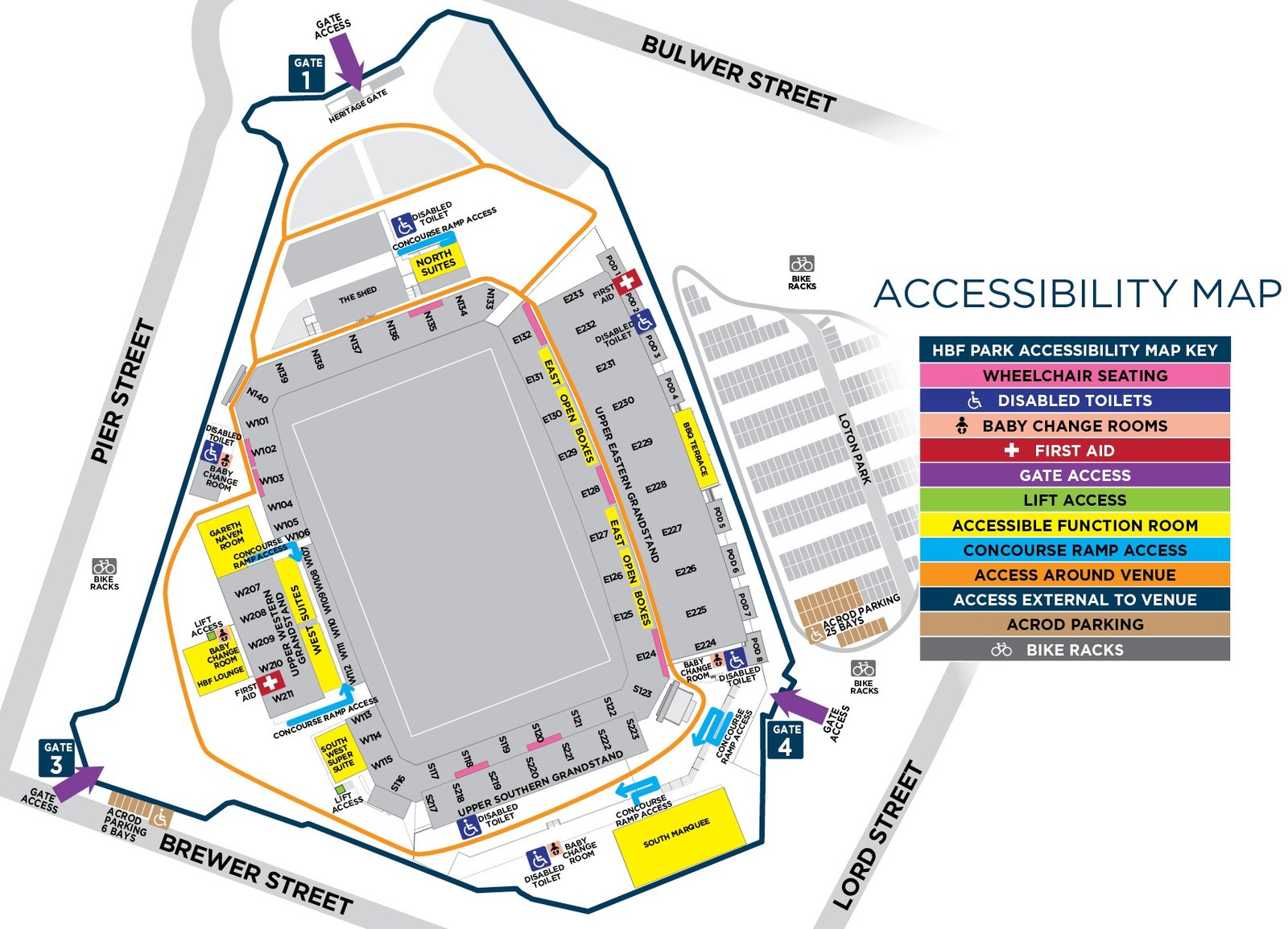 The above map of HBF Park Stadium shows all the accessibility options of the stadium. The location of wheelchair seating, baby change rooms, first aid rooms, gate access, lift access, bike racks, etc. is marked on the map clearly. Nearby roads, all the entry gates, names of the stands, and accessibility parking area, are also depicted on the map.