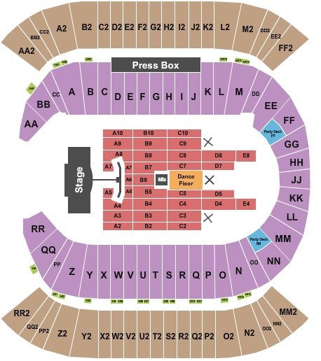 This Stadium is also used for the hosting of concerts. The seating arrangement of concerts is entirely different from the seating arrangement for sports. The location of the stage along with the location of the dance Floor is depicted on the map for easy identification of seats. All the rows of the stadium are marked on the seating arrangement map with the location of the party decks.