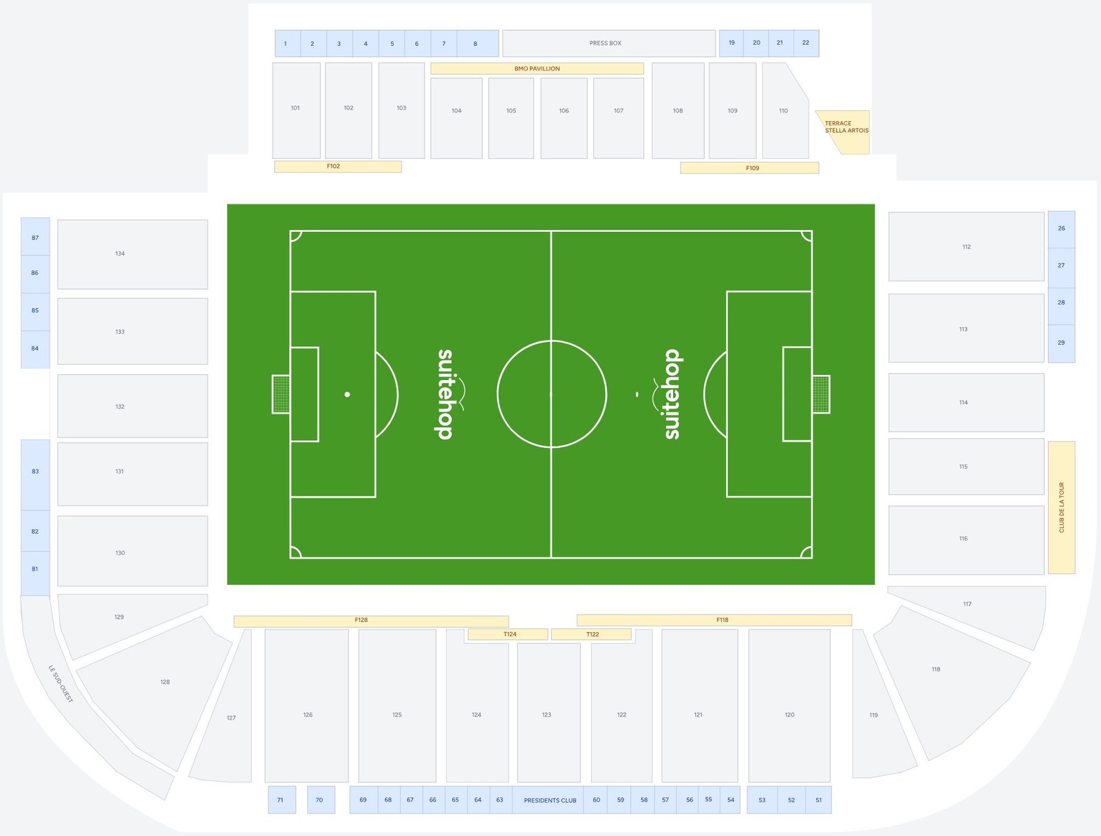 Stade Saputo is a big stadium in terms of seating capacity and a seating plan map is very useful while visiting this Stadium. The seating chart map shows all the rows and stands of the stadium along with numbers. The location of the presidents’ club suites with numbers, press box, suites with numbers, home team area, visitors team area, stands, rows, etc is depicted on the map.
