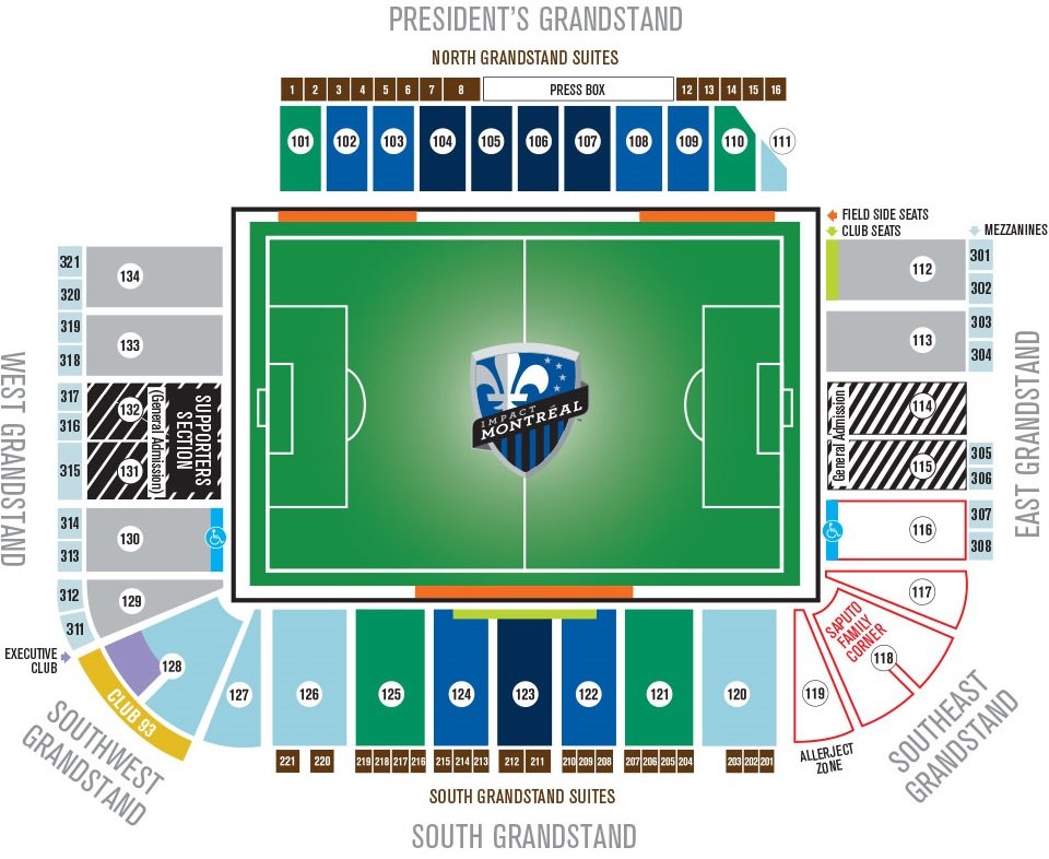 South West Grand Stand, South Grand Stand Suites, Southeast Grand Stand, East Grand Stand, West Grand Stand, President’s Grandstand, etc are shown on the map. The general admission area, field side seats, club seats, supporter sections, club 93, Saputo family corner, Allerject Zone, and Executive Club are depicted on the seating layout map of Saputo Stadium. It is easy to locate seats with the help of the Saputo Stadium seating chart with seat numbers.