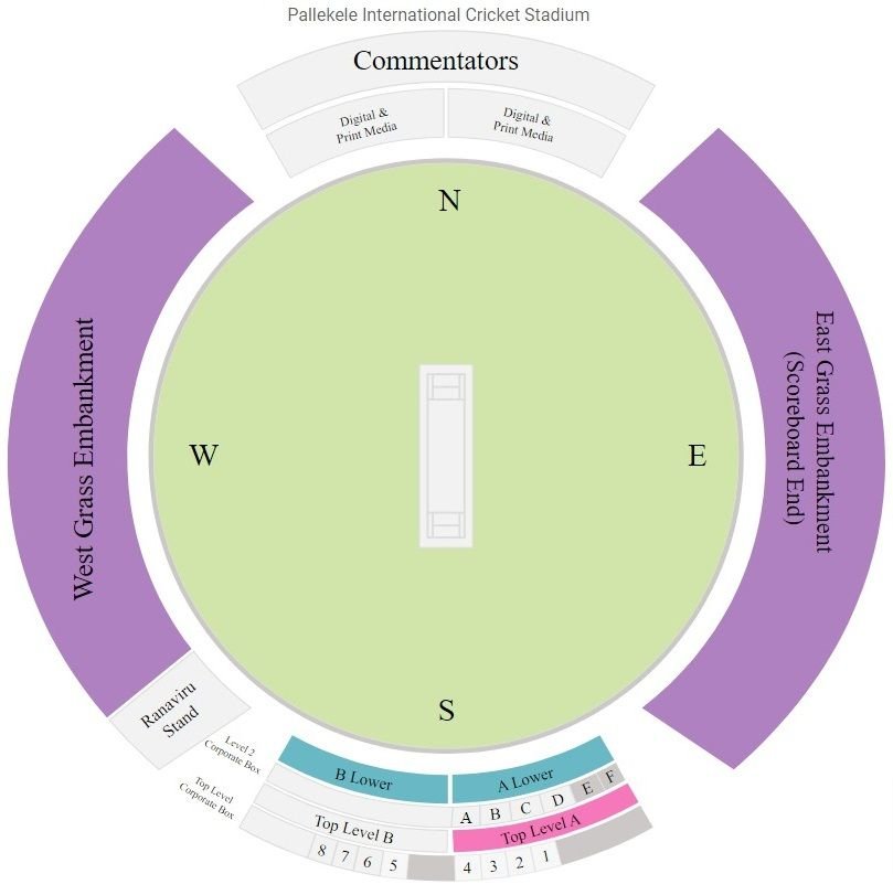 The stadium seating arrangement is very good, as the ground view is very clear from almost all seats. There are various stands such as East Grass Embankment, West Grass Embankment, Commentators stand, Digital and Print Media Stand, Top Level A, Top Level B, A Lower and B Lower stand. These stands have different seat ticket prices for different matches. The seating layout of Pallekele Cricket Stadium is shown by the image, to provide some more clarity.