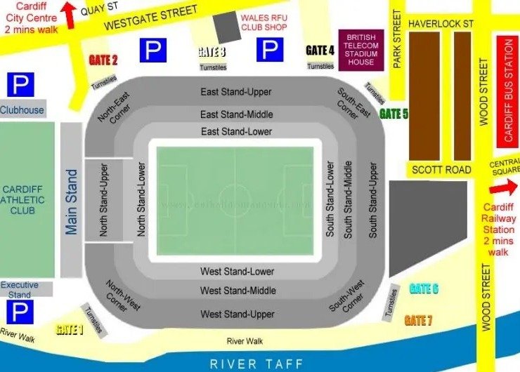 All the important landmarks and necessary information are depicted on the Principality Stadium layout for the convenience of visitors. This stadium is well connected with multiple modes of transport. Visitors are advised to use public transport while visiting this Stadium, especially during big games and events.